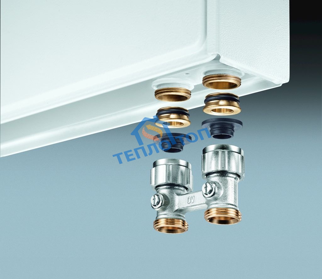 - Присоединительный узел Oventrop „Multiflex F“ ZB (двухтрубный блок) из латуни, никелированный, межтрубное расстояние 50 мм, с мягким уплотнением, запорно-присоединительный.