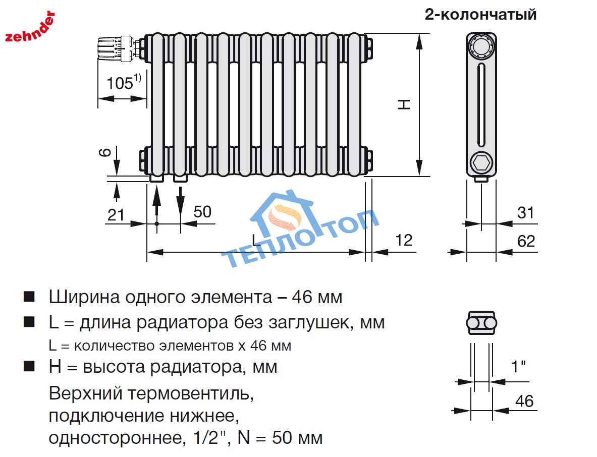 Конструкция 2-х трубный Длина, мм 368 Высота, мм 558 Глубина, мм 62 Теплоотдача (ΔT=50 °C), Вт 344 Теплоотдача (ΔT=60 °C), Вт 432 Цвет Белый (RAL 9016) Диаметр подключения 1/2 дюйма Подключение N69 твв (433, 223,V001,V002) нижнее одностороннее Макс. рабочая температура, °С 120 Рабочее давление, атм 10 Опрессовочное давление, атм 15 Количество секций, шт 8 Межосевое расстояние, мм 50 Вес, кг 7,10 Вес секции, кг 0,89 Материал Сталь Exp., n 1,25 Для отопления помещения, м² 4,73 Страна изготовитель Германия - Оставить отзыв про Радиатор Zehnder Completto 2056 - 8 N69 твв нижнее подключение: